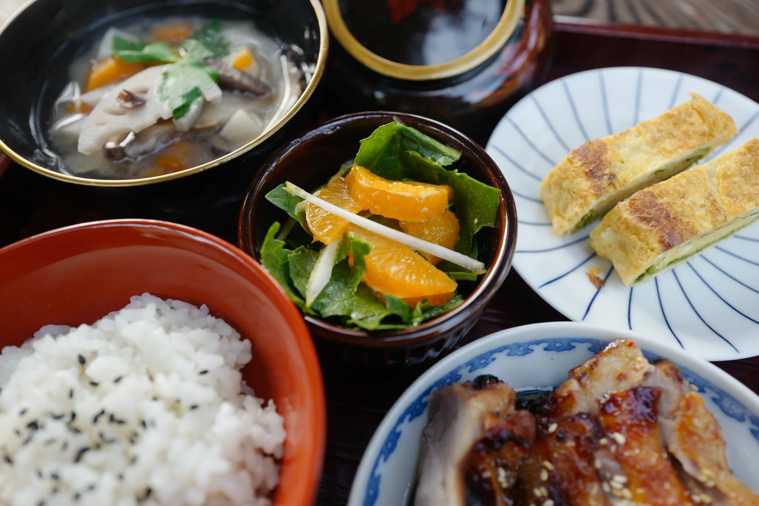 What we serve you depends on what’s the freshest and tastiest in the season you’re here for, so our menu changes daily and it’s next to impossible to say what we’ll serve you in the vintage lacquerware that we saved from a local shrine.